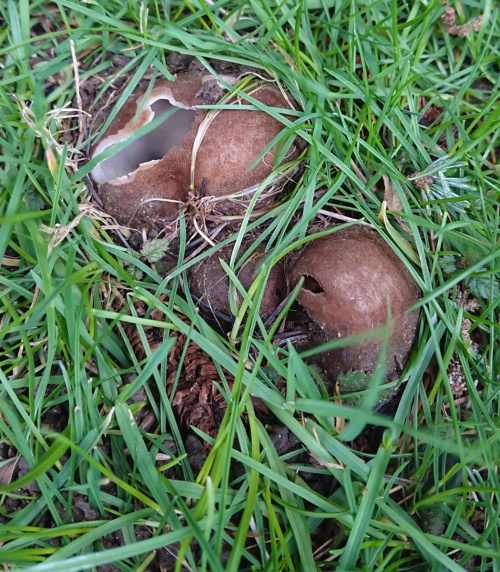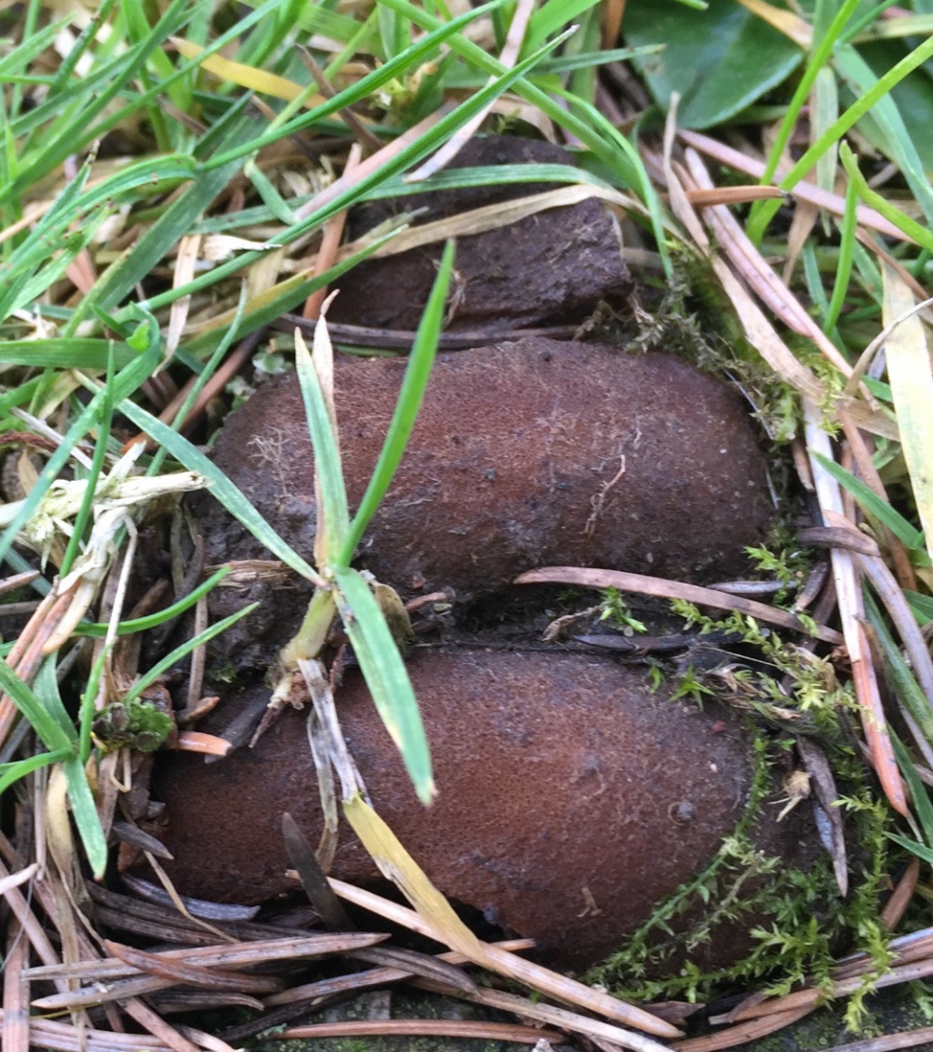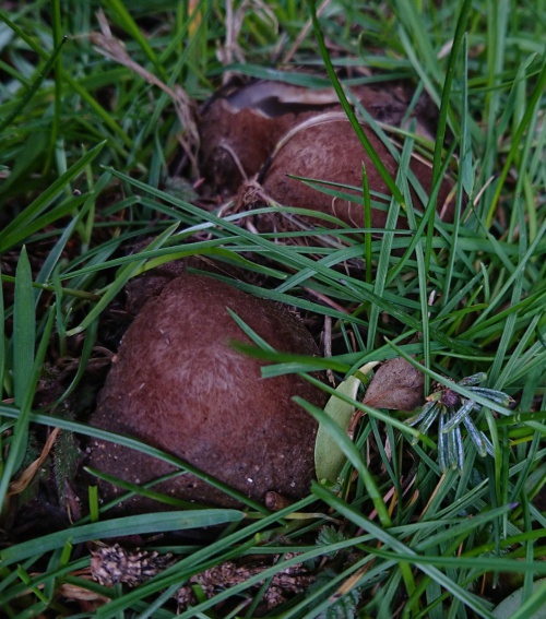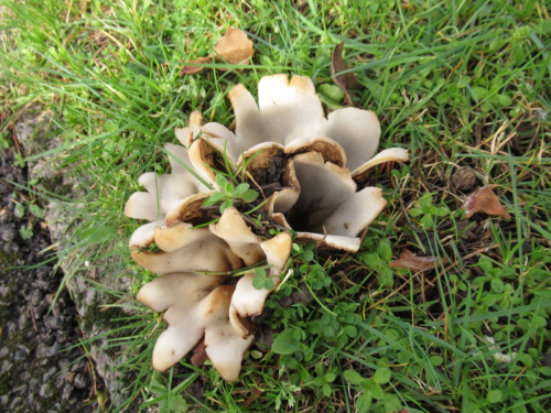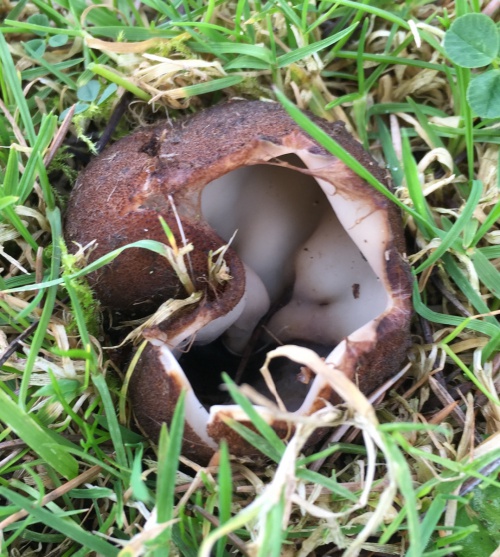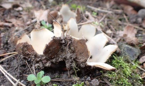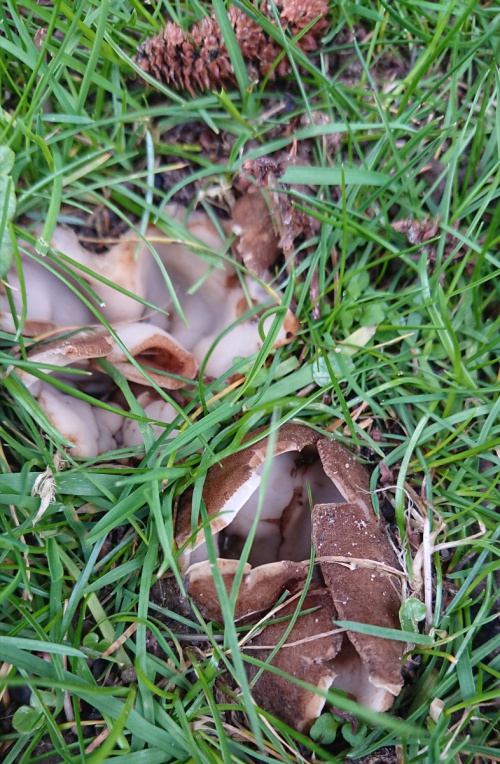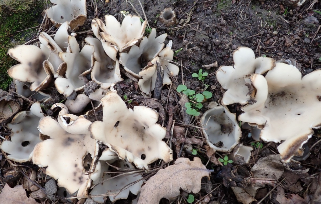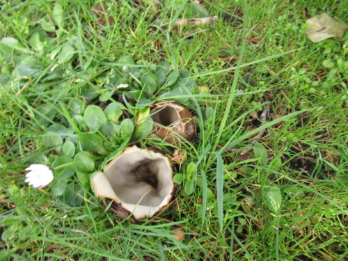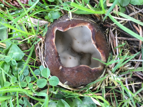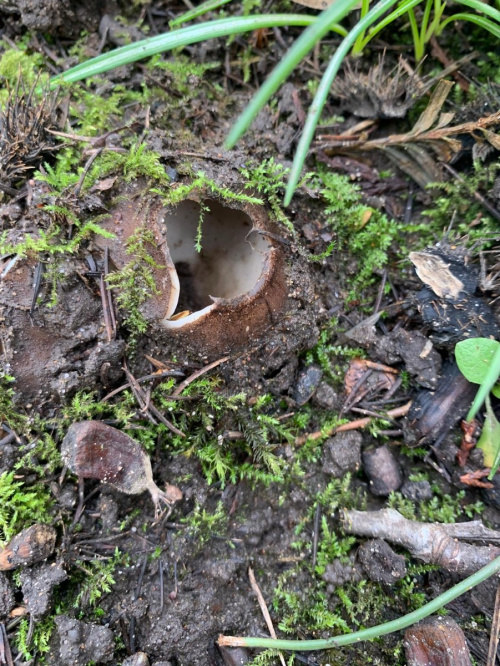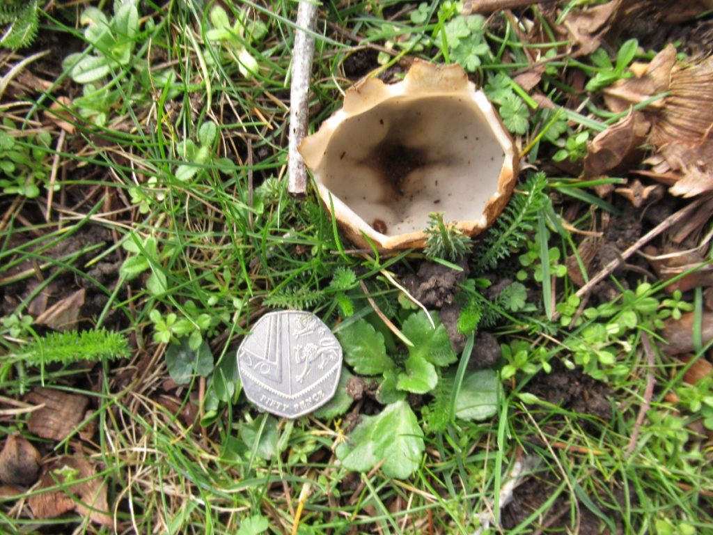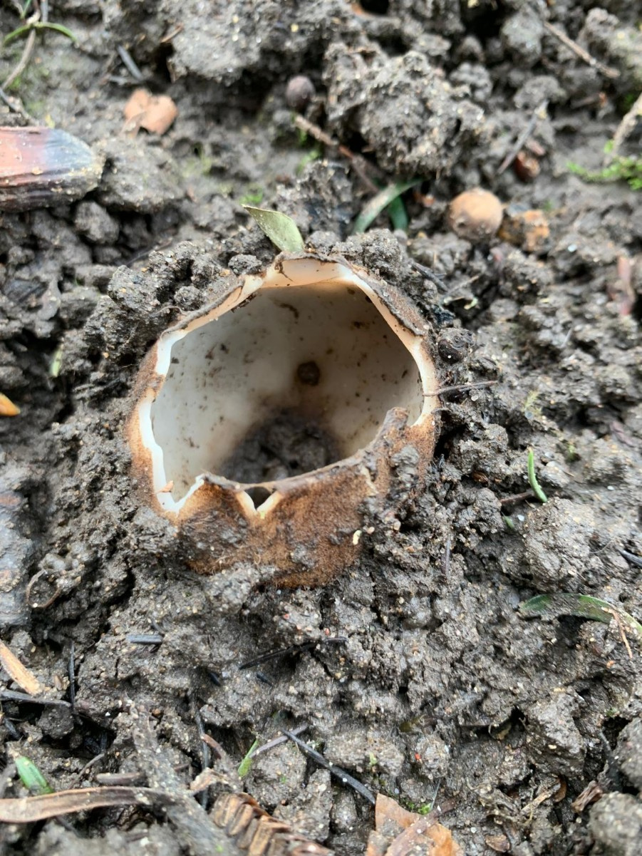 A large cup fungus, partly buried, and almost always under Cedars. It appears in Spring. The outside is hairy and brown, the inner surface smooth and cream.