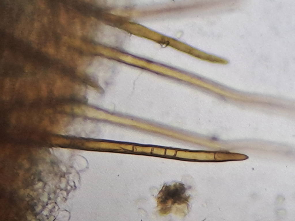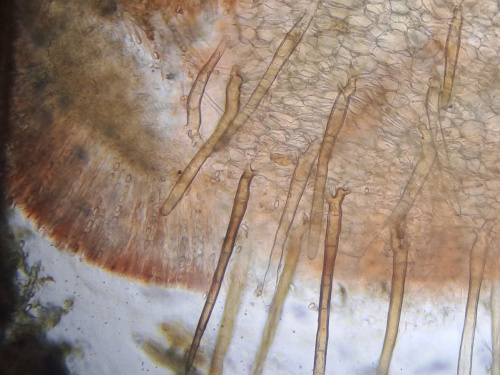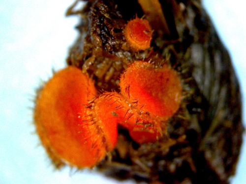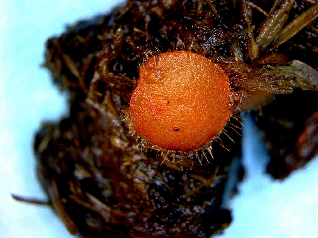 Very small orange discs on dung, usually cowpats, each fringed with dark rooting hairs.